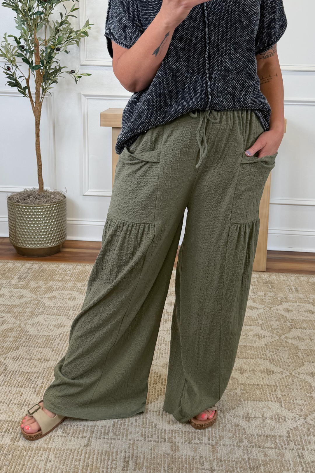 Relaxed, comfy, and effortlessly put together, the Marlow Easy Knit Pants are your new go-to for everyday wear. Designed in a soft textured knit, these wide leg pants feature an elastic waistband with adjustable tie and oversized front pockets for that laid-back, lived-in feel. Easy to dress up or down, they’re perfect for running errands, travel days, or cozy weekends.