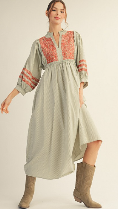 The Olive Blossom Midi Dress brings effortless charm with its blend of comfort and detail. Designed with soft stripes and beautifully embroidered accents across the bodice and sleeves, this piece features 3/4 puff sleeves, a ruffled neckline, and a flowing midi length. The relaxed fit and side slit make it easy to wear for any occasion—pair it with boots for a casual outing or dress it up with sandals for a polished look.