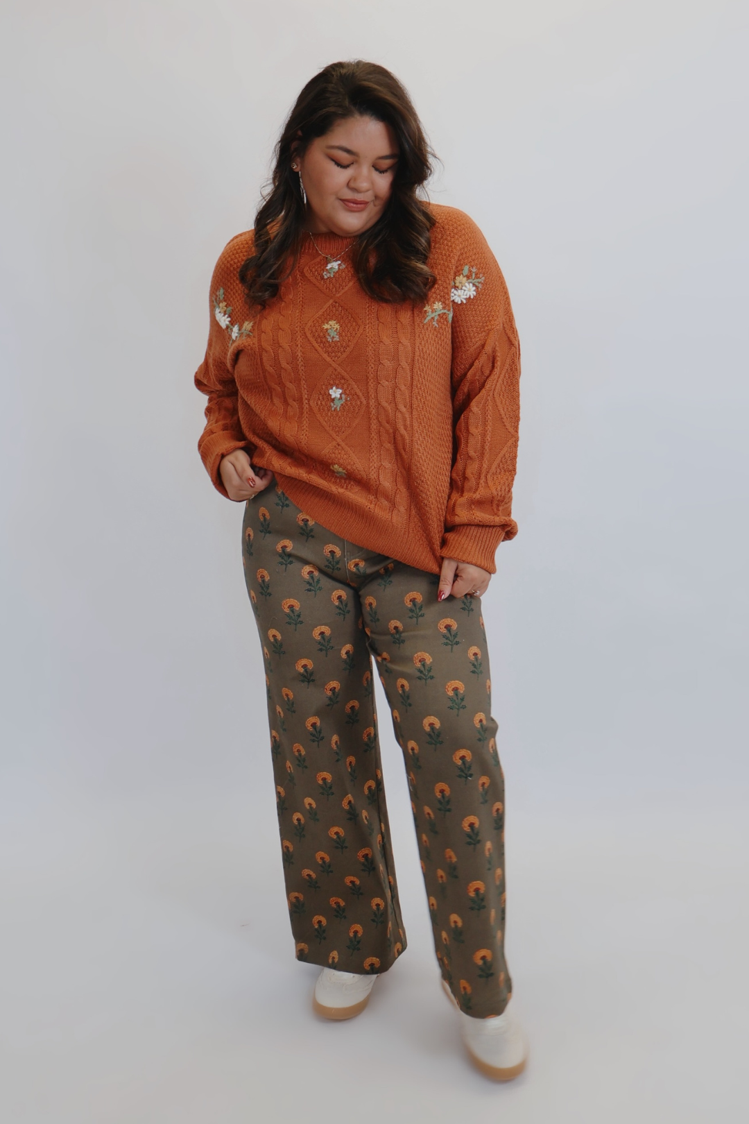 Cozy up in fall’s dreamiest knit. The Marigold Bloom Knit Sweater blends classic charm with sweet floral detailing, making it the perfect statement piece for cooler days. Designed in a warm, copper-toned hue, this sweater features a mix of cable knit textures and delicate embroidered florals that add a soft, feminine touch.