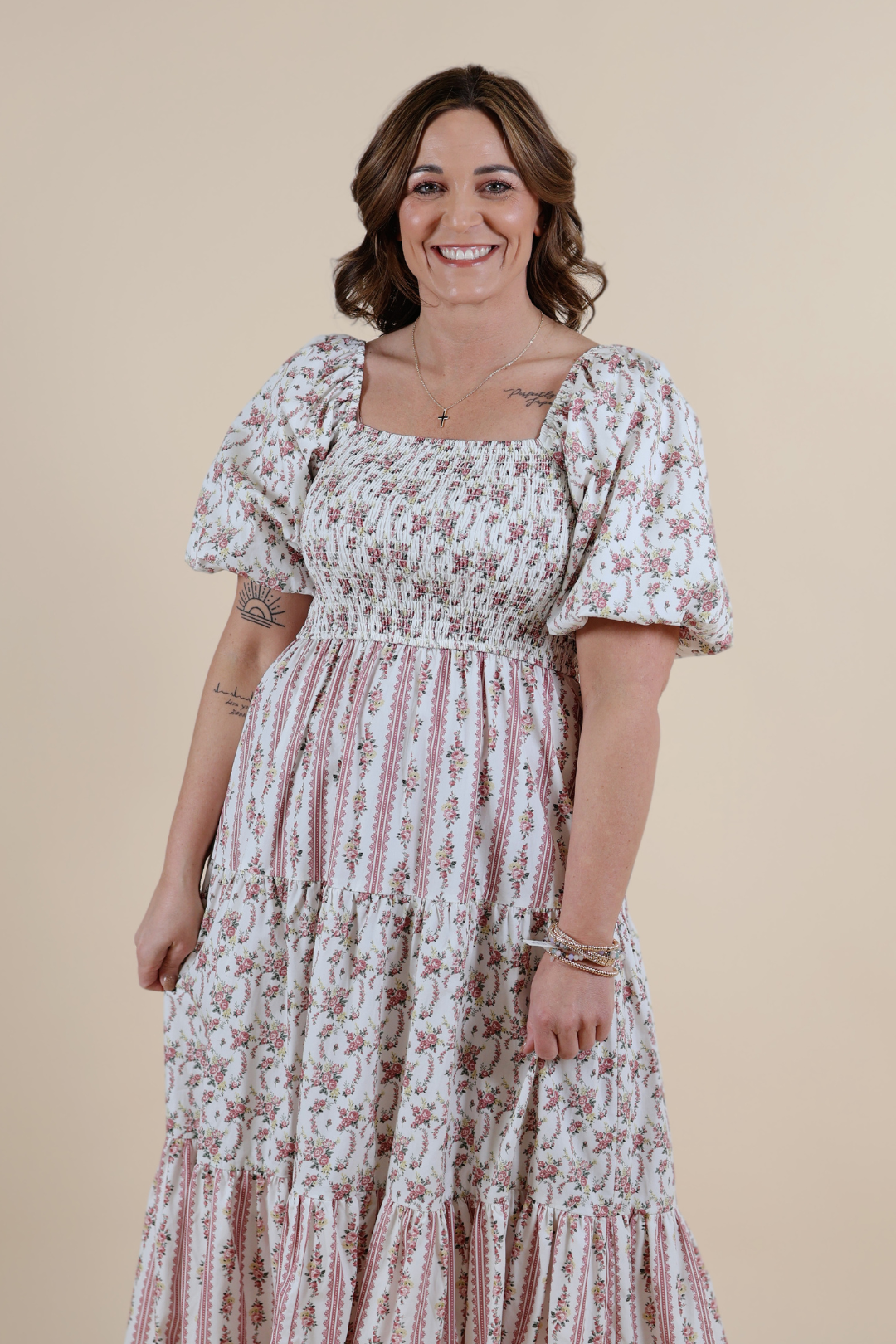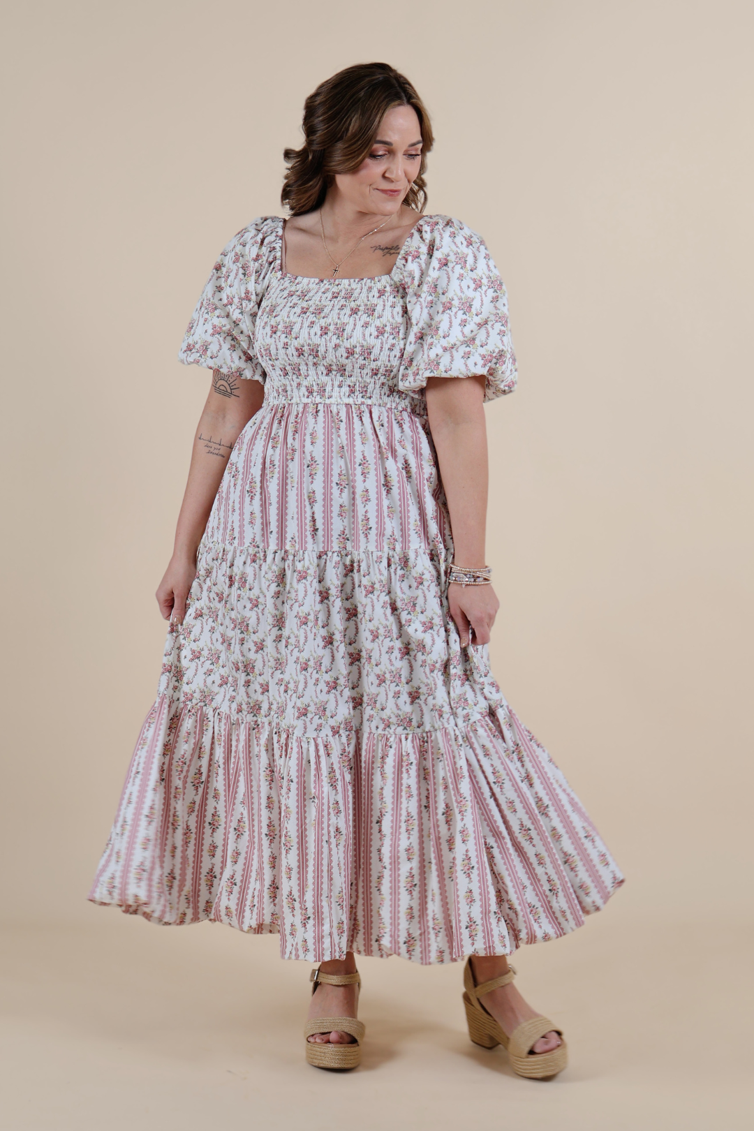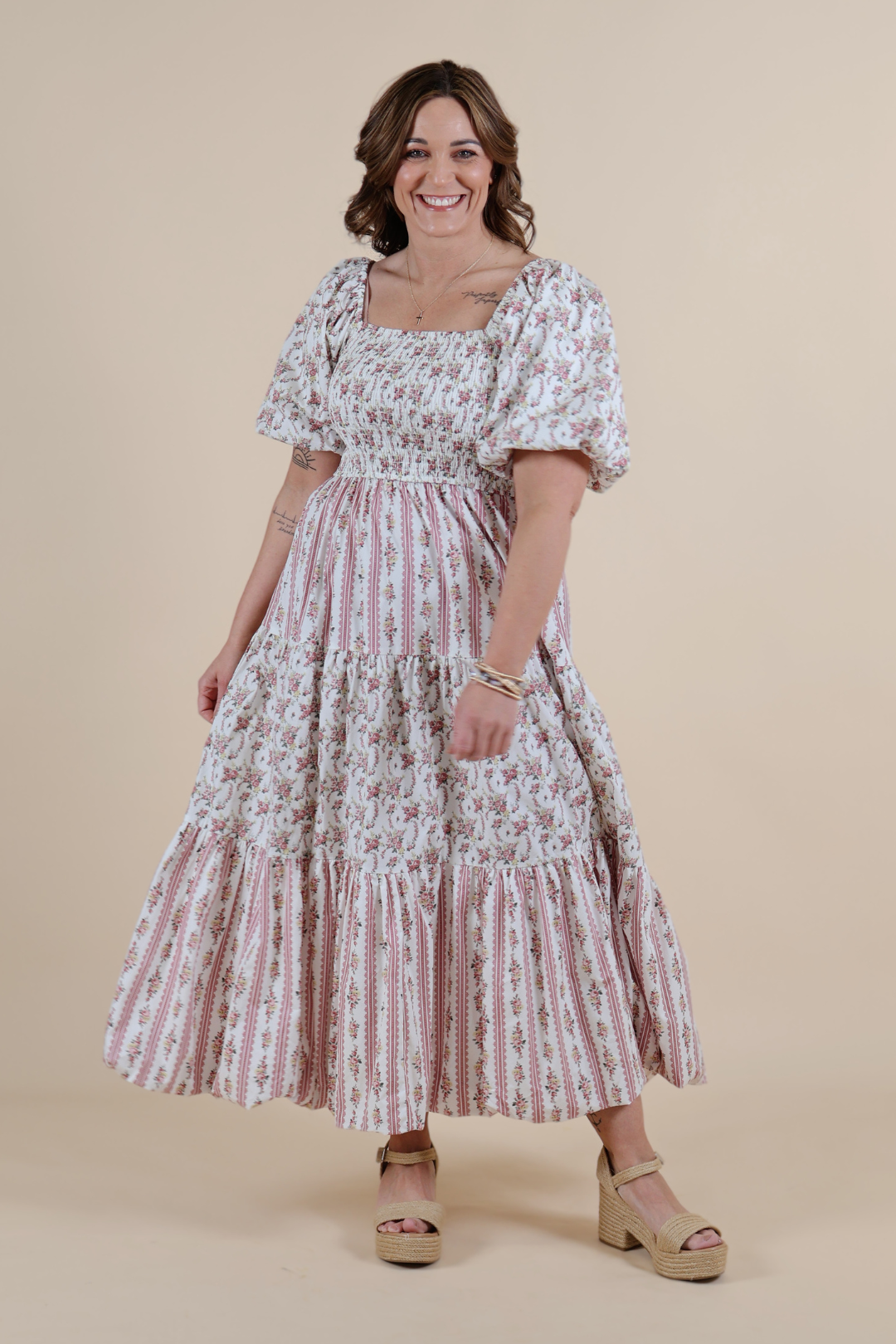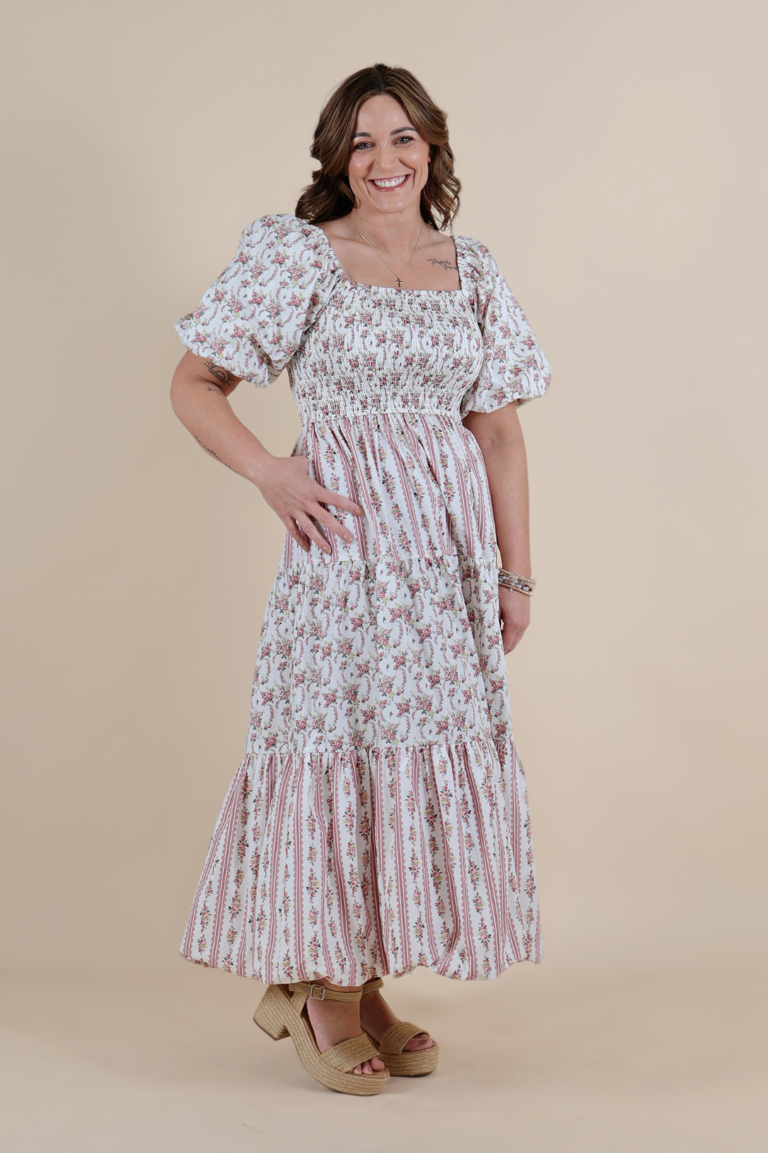 The square neckline and fully smocked bodice create a flattering, comfortable fit that moves with you, while the whimsical bubble sleeves add the sweetest cottagecore touch. A tiered midi skirt flows gracefully with every step, creating that soft, feminine silhouette we can’t get enough of.